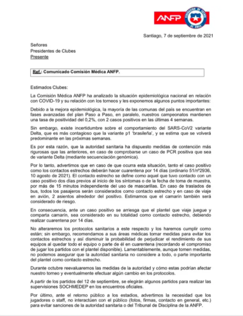 Sin embargo, según reveló La Tercera, la ANFP, a través de la Comisión Médica, alertó a los clubes de una serie de modificaciones debido a la variante delta. A través de una carta enviada el pasado 7 de septiembre se solicitó aumentar los cuidados y en Colo Colo estaban al tanto.