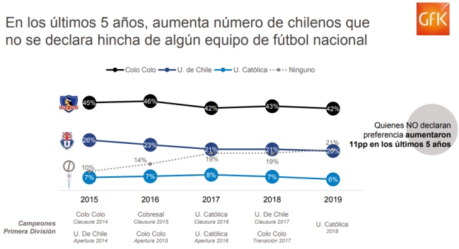 Cabe señalar que en relación a los hinchas en general, aumentó el porcentaje de personas que le gusta un equipo chileno. En 2015 era de un 10% y en 2019 aumentó a un 21 por ciento.