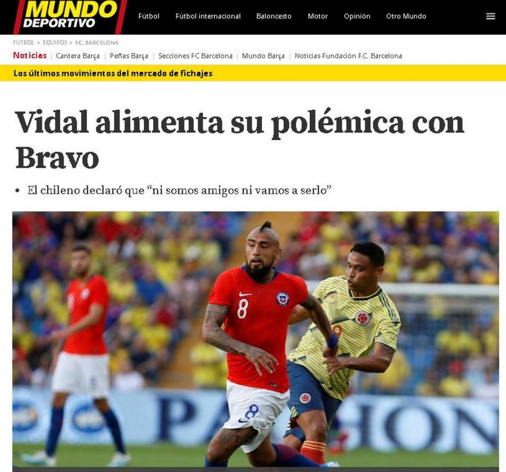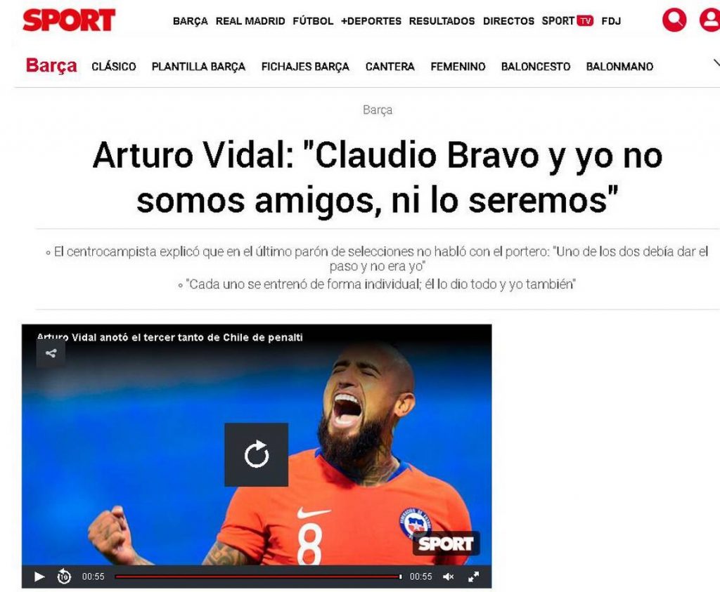 “Arturo Vidal: Claudio Bravo y yo no somos amigos, ni lo seremos”, fue lo que publicó Diario Sport; en tanto mundo deportivo escribió: “Vidal alimenta su polémica con Claudio Bravo”.
