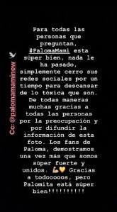 “Paloma está súper bien. Nada le ha pasado. Simplemente cerró sus redes sociales por un tiempo para descansar de lo tóxicas que son“, señaló una historia que compartieron.
