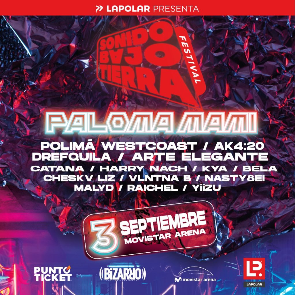 El próximo 3 de septiembre se llevará a cabo el festival “Sonido Bajo Tierra” en el Movistar Arena, donde se presentarán artistas consolidados y emergentes de la escena musical urbana chilena.