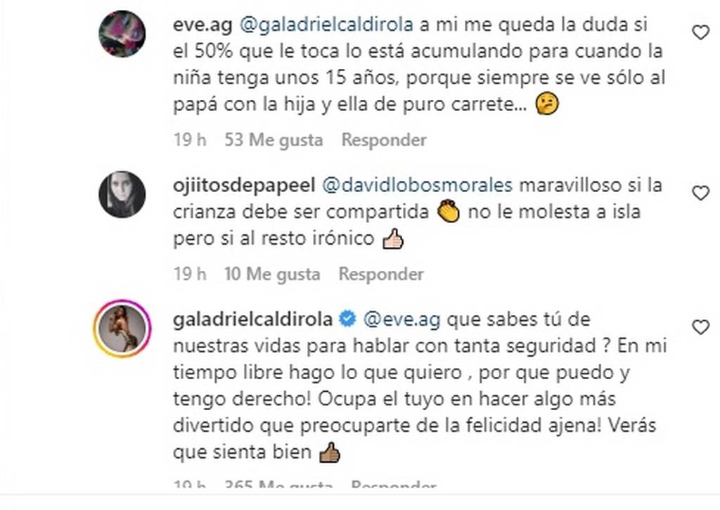 “Mientras, Isla disfrutando con sus hijas”, fue uno de los comentarios que le dejaron, al cual Gala Caldirola respondió: “¡Claro! También tiene que disfrutar con papá”.