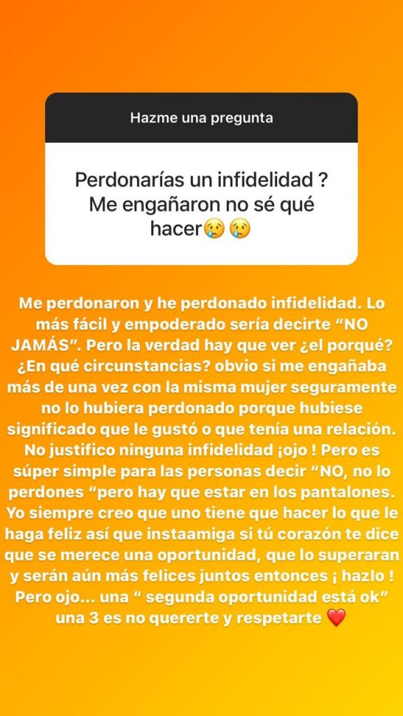 “Me perdonaron y he perdonado infidelidad. Lo más fácil y empoderado sería decirte ‘no jamás’, pero la verdad hay que ver el por qué, en qué circunstancias”, inició analizando la influencer.