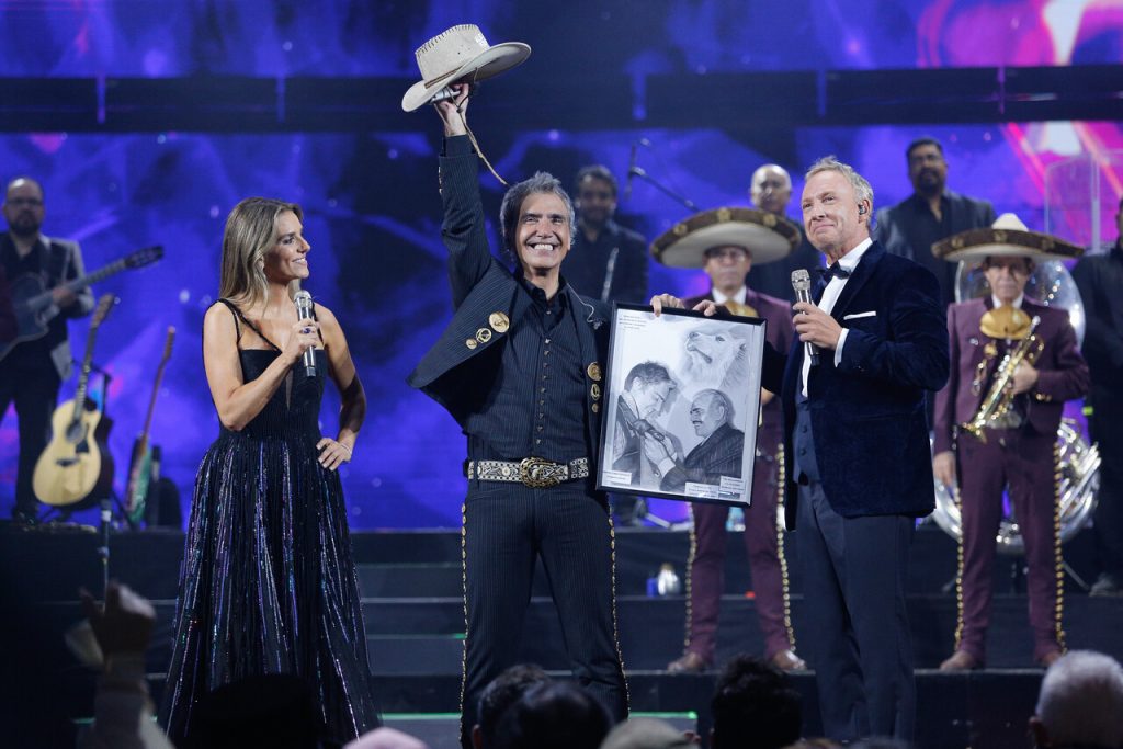 Al final de su espectáculo, los animadores María Luisa Godoy y Martín Cárcamo le entregaron un retrato donde aparece él y su padre, el recordado Vicente Fernández.