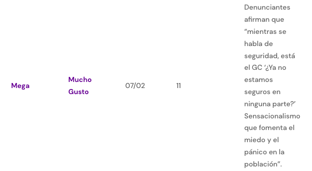 Finalmente, existen 11 denuncias que apuntan a “sensacionalismo” en un Generador de Caracteres (GC) de “Mucho Gusto”.