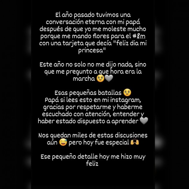 “El año pasado tuvimos una conversación eterna con mi papá, después de que yo me molesté mucho porque me mandó flores para el 8 de marzo, con una tarjeta que decía ‘Feliz día, mi princesa’“, relató la influencer en las historias de su cuenta de Instagram.