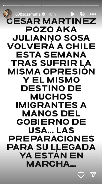 Ahora, en un comunicado compartido por la cuenta del artista, se confirmó su regreso a Chile: “Cesar Martínez Pozo AKA Julianno Sosa volverá a Chile esta semana tras sufrir la misma opresión y el mismo destino de muchos inmigrantes a manos del gobierno de Estados Unidos… Las preparaciones para su llegada ya están en marcha“, confirmando además que arribará al país el próximo 22 de julio.