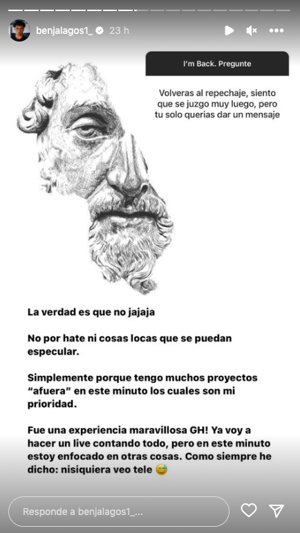 A raíz de ello, Benjamín contestó a una pregunta que decía lo siguiente en su Instagram: “volverás al repechaje? siento que se te juzgó muy luego, pero tú solo querías dar un mensaje”.