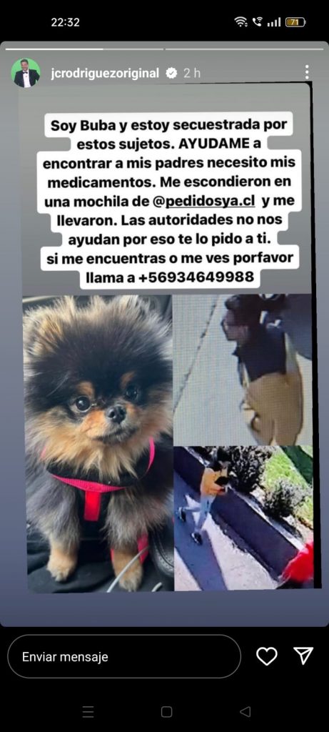 Julio César Rodríguez acusó el secuestro de Buba, una de sus perritas. El animador de CHV utilizó sus redes sociales para apuntar contra la justicia por no movilizar sus recursos en el caso. La perrita de Jotacé “necesita remedios y cuidados especiales”.
