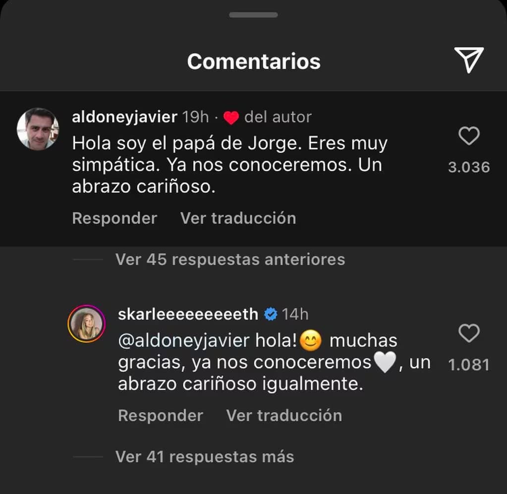 “Hola soy el papá de Jorge. Eres muy simpática. Ya nos conoceremos. Un abrazo cariñoso“, le escribió en la plataforma de Instagram.