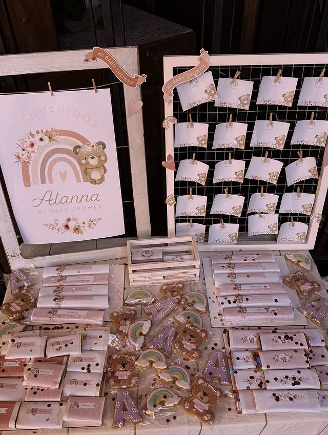 La decoración del baby shower estuvo cargada de ternura, con elementos que incluyeron osos de peluche, galletas temáticas, tarjetitas personalizadas y adornos en tonos pastel.
