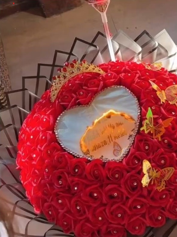 AK4:20 llegó con un impresionante ramo de cerca de 50 rosas rojas, pero el detalle que se robó toda la atención fue un corazón de papel entre las flores.