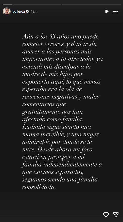 Ballero aseguró haberle pedido disculpas directamente a Ludmila, pero también quiso dejar en claro ante sus seguidores que no tuvo intención de exponerla ni de generar reacciones negativas. “Ya extendí mis disculpas a la madre de mis hijos por exponerla aquí, lo que menos esperaba era la ola de reacciones negativas y malos comentarios que gratuitamente nos han afectado como familia”, escribió.