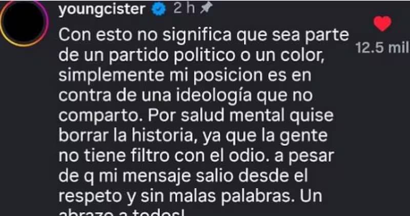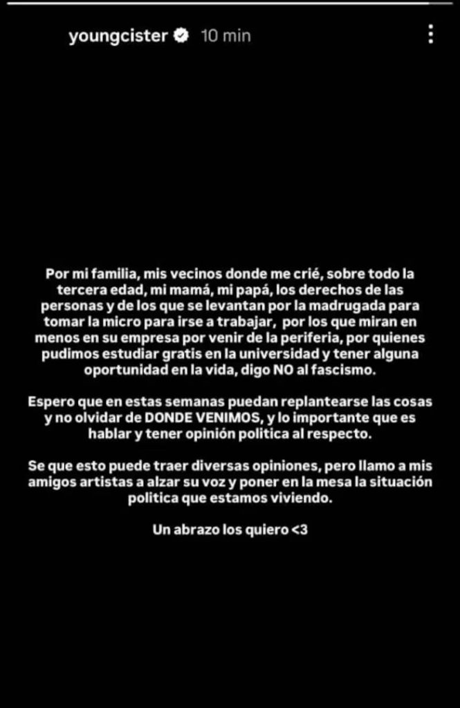 Young Cister hizo un llamado a la reflexión colectiva. “Espero que en estas semanas puedan replantearse las cosas y no olvidar de DÓNDE VENIMOS“, pidió a sus seguidores. Reconoció la importancia de “hablar y tener opinión política” en el momento actual.