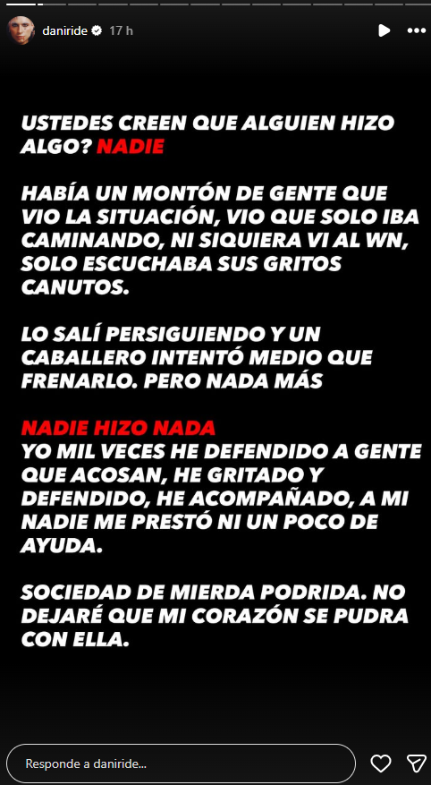 Dani intentó perseguir al atacante, y aunque un hombre intentó detenerlo, no fue suficiente. “Yo mil veces he defendido a gente que acosan, he gritado, he acompañado. A mí nadie me prestó ni un poco de ayuda. Sociedad de mierda podrida”, sentenció.