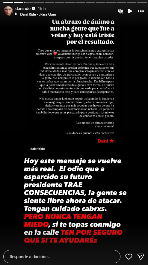 Finalmente, envió un mensaje a sus seguidores para que no se dejen intimidar. “Tengan cuidado cabrxs. Pero nunca tengan miedo. Si te topas conmigo en la calle, ten por seguro que sí te ayudaré”, concluyó Dani Ride, reafirmando su compromiso con la empatía y el respeto.
