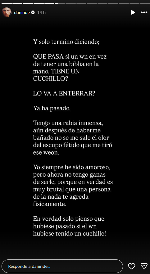 El cantante Dani Ride denunció un violento ataque mientras caminaba por las calles de Santiago Centro. El hecho ocurrió la tarde del martes y fue relatado por el artista a través de sus redes sociales, donde detalló que un sujeto desconocido lo escupió en la cara sin provocación alguna.