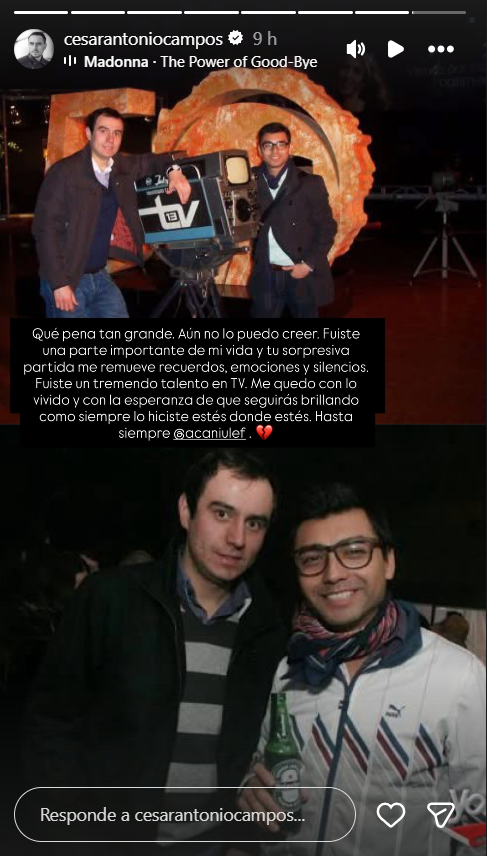 “Qué pena tan grande. Aún no lo puedo creer. Fuiste una parte importante de mi vida y tu sorpresiva partida me remueve recuerdos, emociones y silencios”, escribió Campos, visiblemente afectado por la noticia.