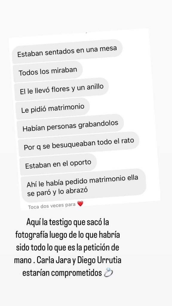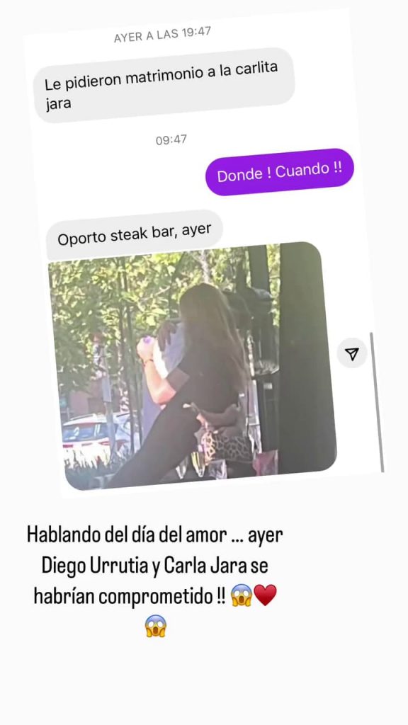 La información fue reforzada por la periodista Paula Escobar, quien en sus historias de Instagram aseguró que la pareja efectivamente se habría comprometido. “Hablando del día del amor, ayer Diego Urrutia y Carla Jara se habrían comprometido“, escribió.
