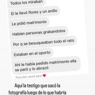 Además, compartió el testimonio de un testigo presencial: “Estaban en una mesa, él le llevó flores y un anillo. Ella se paró y lo abrazó“.