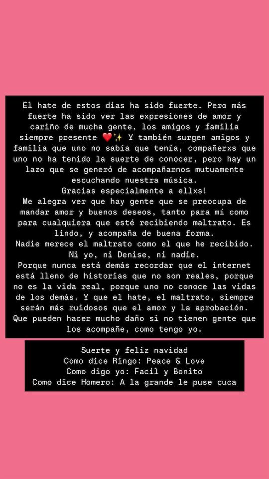 El cantante hizo un llamado a detener el maltrato en redes sociales, dejando en claro que tanto él como su ex pareja han sido afectados por estos ataques. “Nadie merece el maltrato como el que he recibido. Ni yo, ni Denise, ni nadie”, expresó tajantemente.