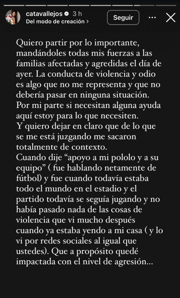 A través de sus redes sociales, Vallejos compartió su visión de los hechos mientras estaba en el estadio, responsabilizando inicialmente a los hinchas de la U por los desórdenes. “¿Qué les costaba portarse bien? Toda la gente de Independiente que debería estar ahí no puede estar porque les están tirando cosas desde arriba”, expresó la influencer en su cuenta de Instagram.
