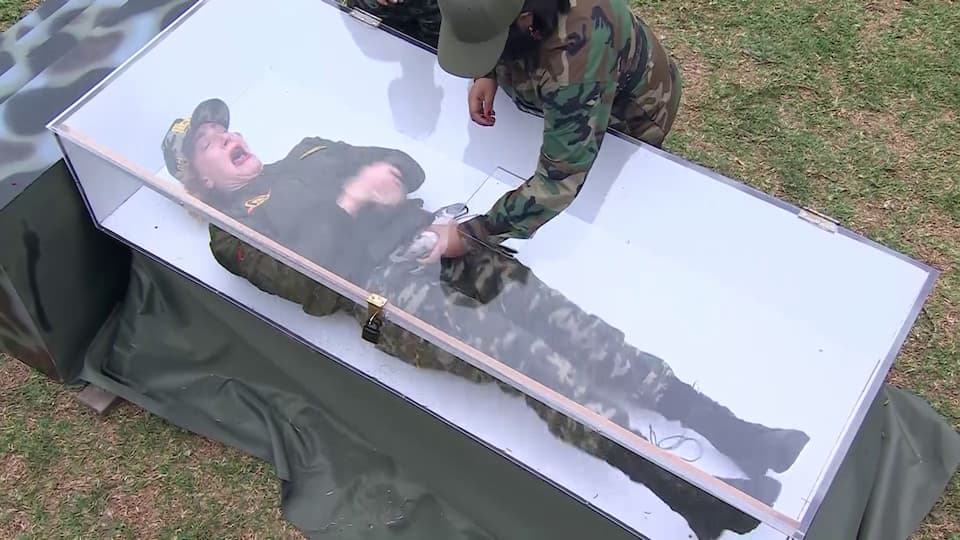 El reto, anunciado por la Comandante Arratia, consistía en que un integrante de cada dupla se encerrara en una caja que se llenaría con animales o insectos. El otro debía cruzar un circuito para recuperar una llave sumergida en un balde lleno de carne cruda y liberar a su compañero.