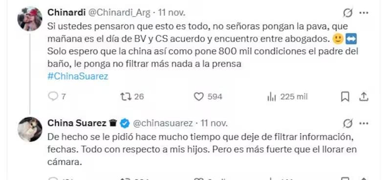 Todo comenzó con un comentario que una seguidora le dejó a Suárez en la red social X. La usuaria anticipaba un importante encuentro entre las partes. “Mañana (por el miércoles 12) es el día de Benjamín Vicuña y China Suárez… acuerdo y encuentro entre abogados“, escribió.