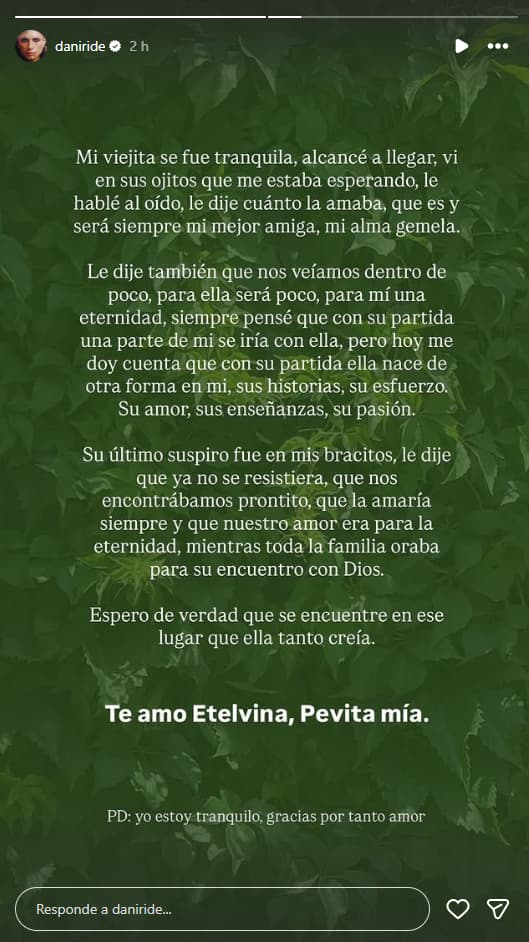 En una serie de historias de Instagram, Dani Ride quiso agradecer el apoyo recibido y compartir más detalles sobre la despedida de su abuela. “Mi viejita se fue tranquila. Alcancé a llegar, vi en sus ojitos que me estaba esperando”, reveló el artista con emoción.
