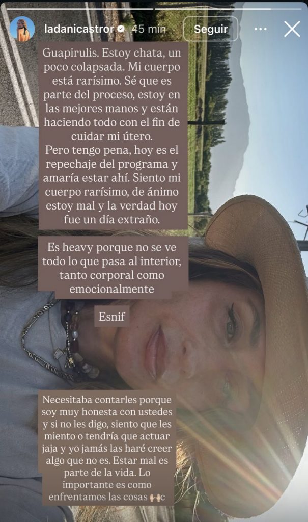Asimismo, aclaró que decidió compartir su sentir con sus seguidores desde la honestidad, destacando que estar mal también es parte de la vida y del proceso de sanación. En otra publicación, mostró la inflamación de su útero, acompañando la imagen con la palabra “Sanando”.