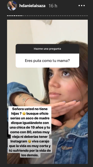 “Señora, ¿Usted no tiene hijas? Busque oficio. Serías un asco de madre dizque, igualándote con una chica de 19 años y tú como con 80. Estás vieja, ni deberías tener Instagram. ¡Viva carajo! que la vida es muy y tú sufriendo por la vida de los demás”, manifestó Daniela Isaza.