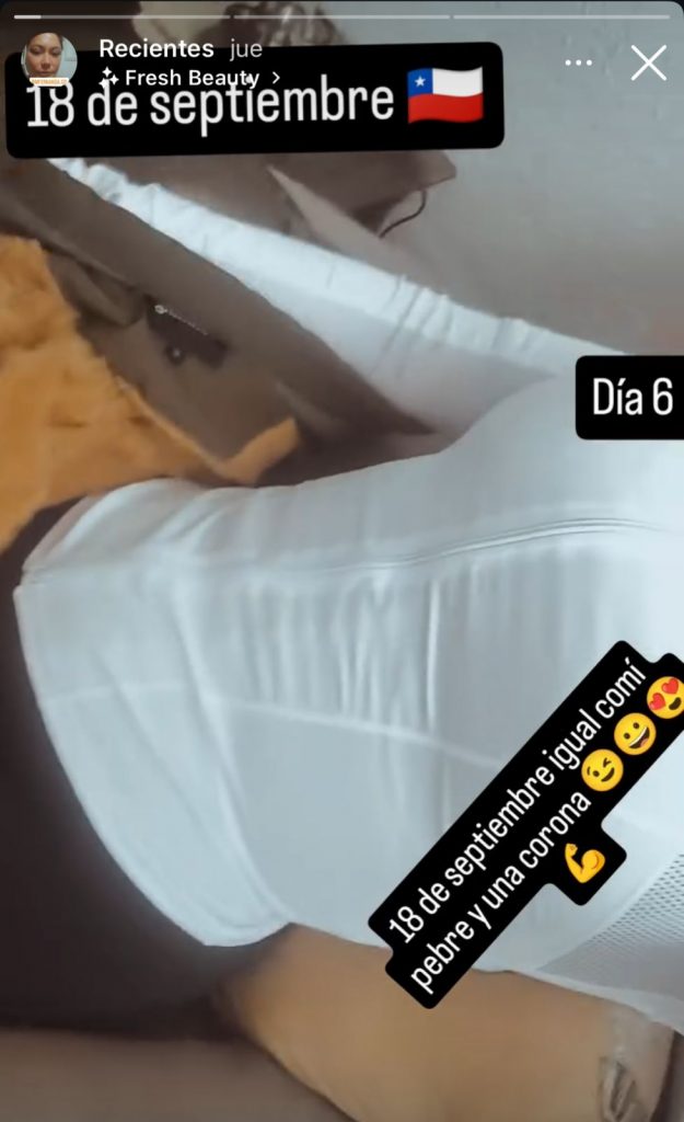 Durante las celebraciones de Fiestas Patrias, la exmodelo mostró cómo ha evolucionado su recuperación. “Día 6, ahí mi cintura, cadera, trasero. Voy a quedar bonita. Estoy todavía muy moradita, por eso me pongo este polerón que es más largo. Esto me tiene que bajar”, comentó entre risas.
