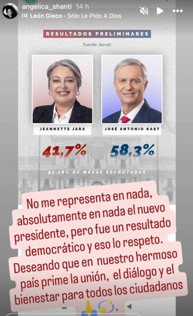 “No me representa en nada, absolutamente en nada el nuevo presidente. Pero fue un resultado democrático, y eso lo respeto”, escribió de forma tajante en sus historias.