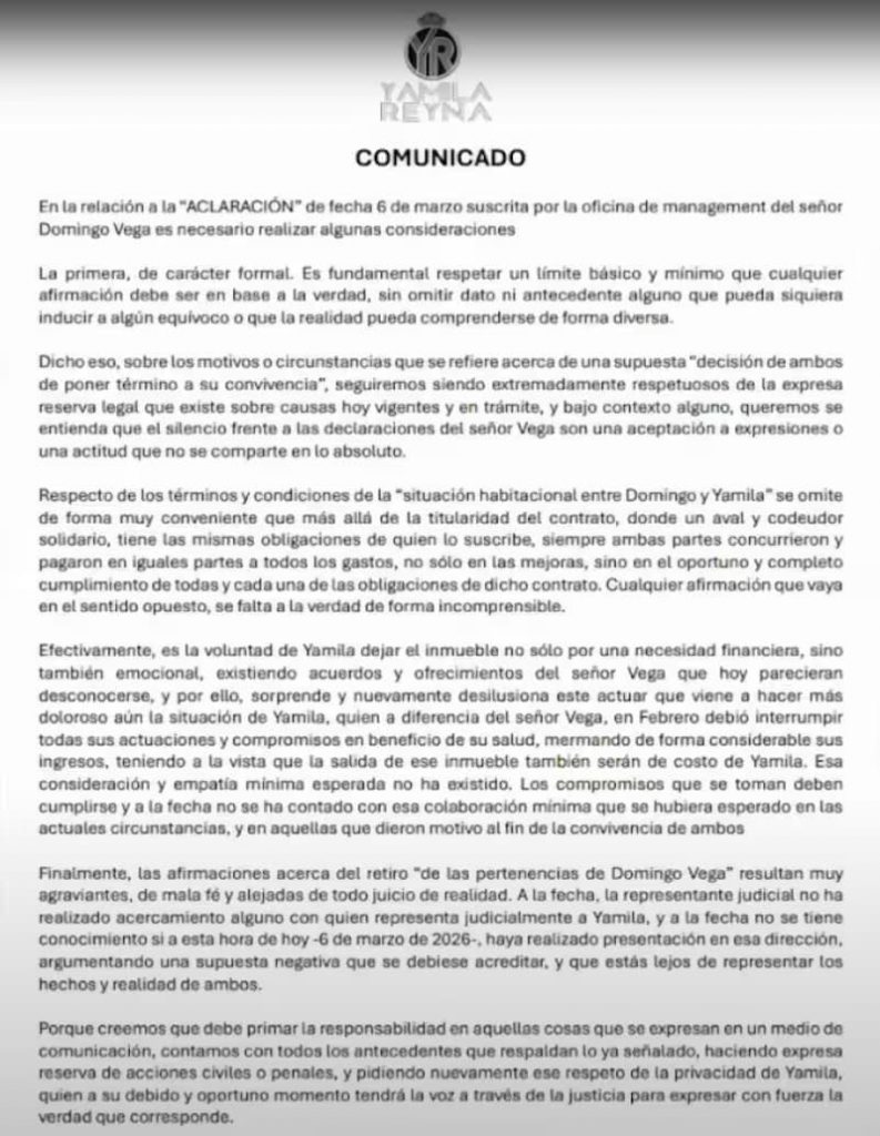La defensa también desmintió categóricamente que Reyna esté impidiendo el retiro de objetos personales desde la vivienda. “Las afirmaciones acerca del retiro de las pertenencias de Domingo Vega resultan muy agravantes, de mala fe y alejadas de todo juicio de realidad”, puntualizaron.
