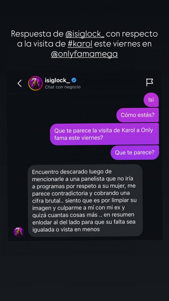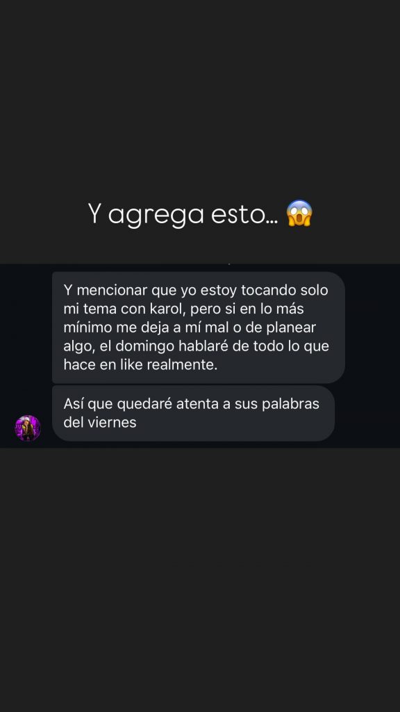 Luego subió el tono y lanzó un mensaje sin rodeos: “Te invito, Karol, al viernes no victimizarte o me conocerás lo sapa que puedo ser con todo tus detallitos de Like (Media) y menores…”.