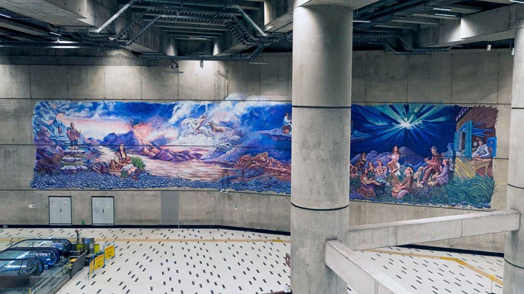 En 2023 diseñó una de sus obras más imponentes: un mural de 30 metros por 6 en la estación Cal y Canto del Metro de Santiago.