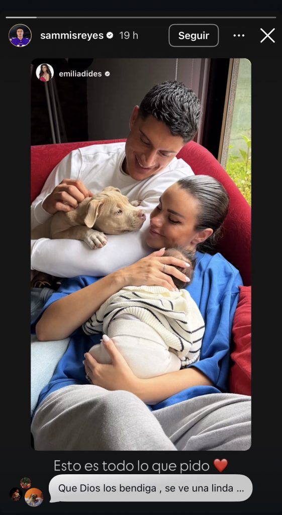 En sus historias de Instagram, el deportista republicó una fotografía donde aparece junto a Emilia Dides, su hija recién nacida y el perrito que presentaron recientemente como nueva mascota.