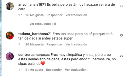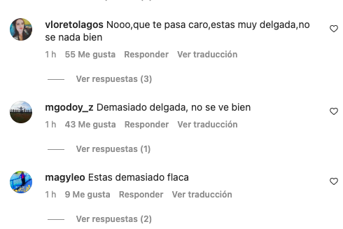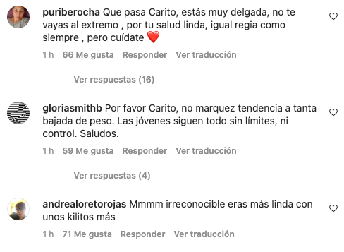 “Estás proyectando una imagen poco saludable”, “¿qué pasa Carito? Estás muy delgada”, “por favor Carito, no marques tendencia a tanta bajada de peso” y “muy lindas tus fotos, pero estas muy delgada”, fueron parte de las reacciones.