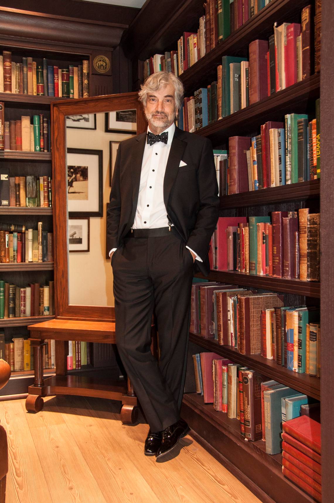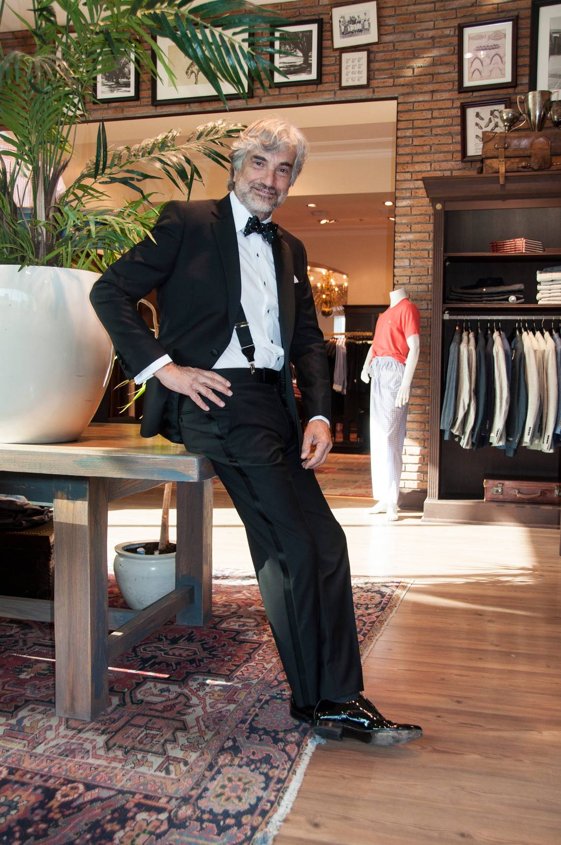 Las solapas del elegante traje son de satín, sus pantalones serán lisos y de la misma textura. El conjunto será acompañado por una clásica camisa de algodón americano, condecorado con una humita de seda y suspensores con terminaciones de cuero de becerro.