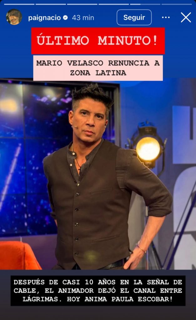 Tras casi 10 años en Zona de Estrellas, Mario Velasco habría renunciado al programa de farándula de Zona Latina, según información difundida por Pablo Candia, panelista de Primer Plano.