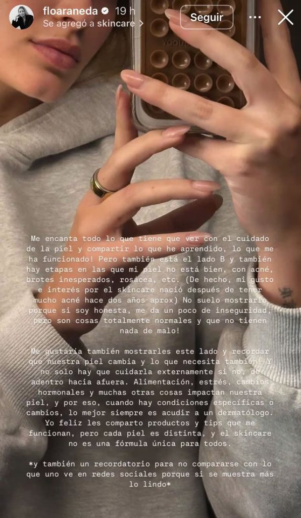 Florencia, que habitualmente comparte tips y productos para el skincare, confesó que esta vez le costó mostrar la parte menos estética de su rutina.