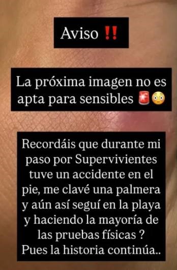 “Aviso. La próxima imagen no es apta para sensibles. ¿Recordáis que durante mi paso por ‘Supervivientes’ tuve un accidente en el pie, me clavé una palmera, y aún así seguí en la playa y haciendo la mayoría de las pruebas físicas? Pues la historia continúa”, escribió Gala en sus historias de Instagram, acompañando el texto con imágenes gráficas del objeto que salió de su pie.