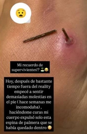 La ex de Mauricio Isla explicó que venía sintiendo molestias desde hace semanas, pero que recién ese día, al realizarse una cura, el cuerpo expulsó el objeto de forma natural. “Mi recuerdo de ‘Supervivientes’. Hoy, después de bastante tiempo fuera del reality, empecé a sentir demasiadas molestias en el pie (hace semanas me incomodaba). Haciéndome curas, mi cuerpo expulsó solo esta espina de palmera que se había quedado adentro”, detalló.