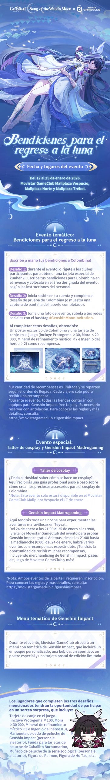 Durante la noche, los asistentes disfrutarán de minijuegos, trivias, desafíos musicales y pruebas en el Abismo, con premios físicos y la presencia de cosplayers invitados hasta la medianoche. También se entregarán pases gratuitos para GameClub y figuras coleccionables de Genshin Impact.