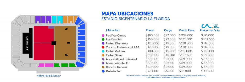 Los precios de los tickets varían entre los $52.000 y los $207.000, dependiendo de la ubicación dentro del recinto.
