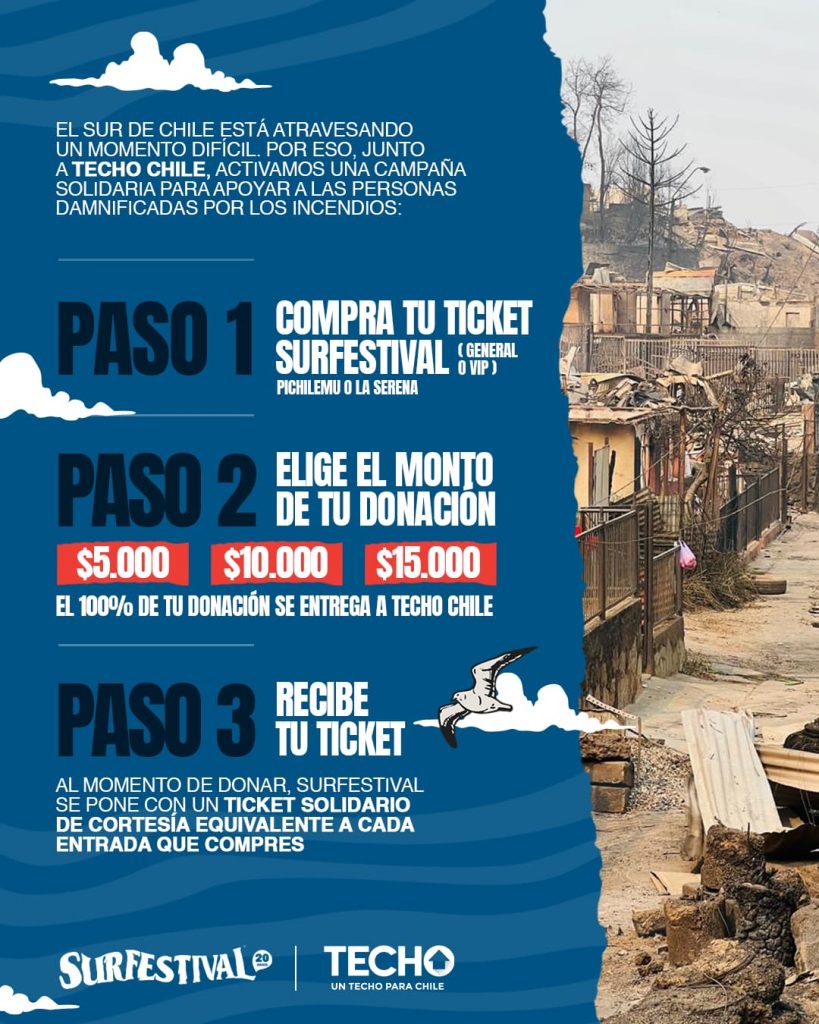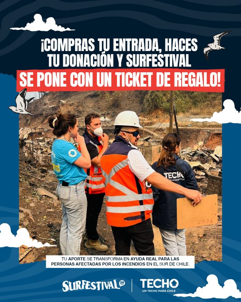 La propuesta es simple: al comprar entradas para el Surfestival 2026, puedes hacer una donación voluntaria a Techo, y a cambio recibirás tickets de cortesía equivalentes a la cantidad comprada.
