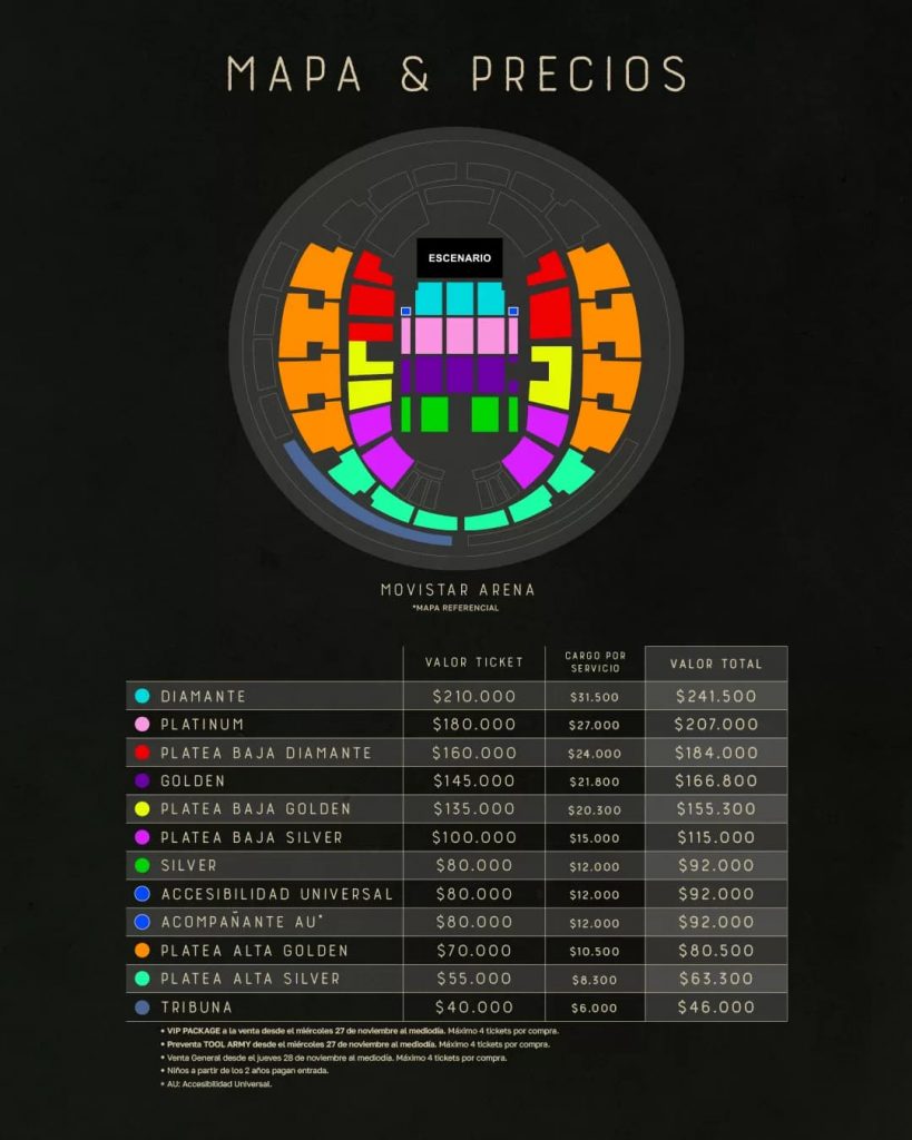 La venta de entradas comenzará el próximo 27 de noviembre al mediodía, con una preventa exclusiva para los miembros de Tool Army a través de PuntoTicket. Para el público general, la venta se habilitará el 28 de noviembre al mediodía.