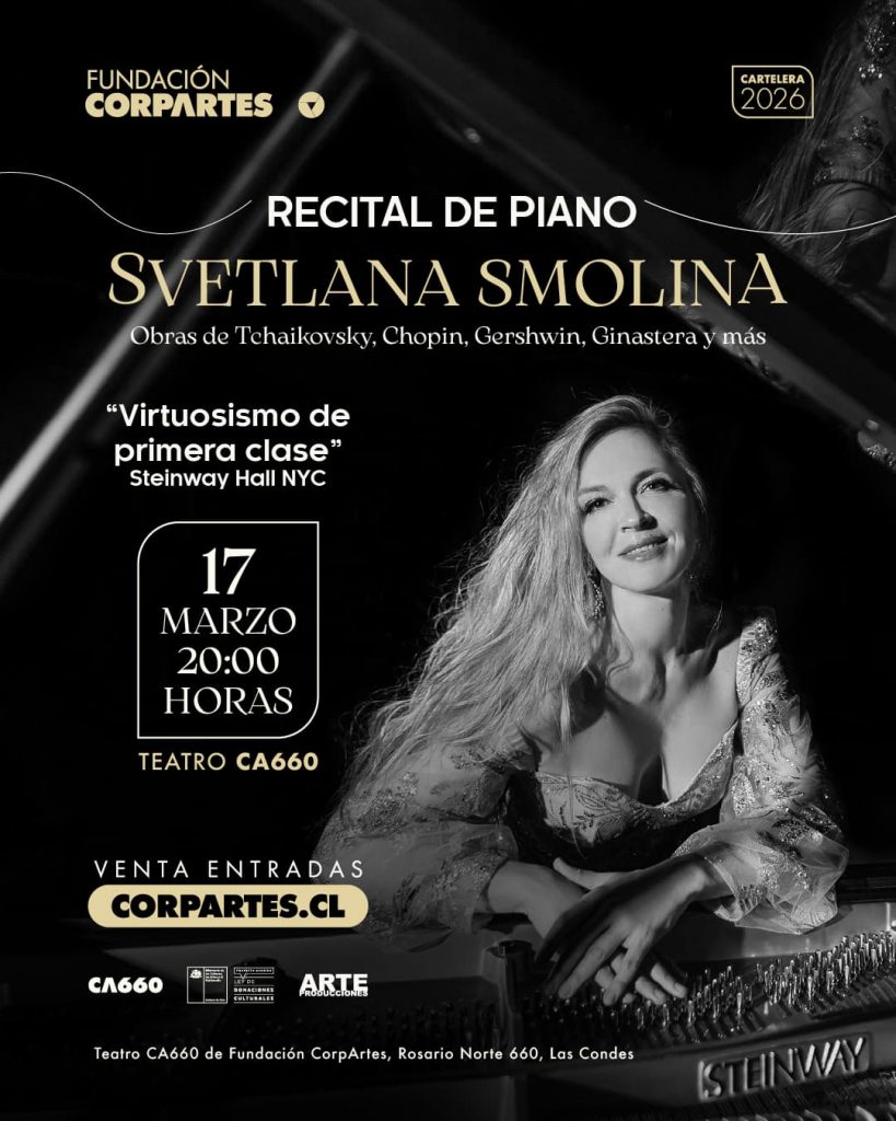 La Fundación CorpArtes presentará un concierto de alto nivel el próximo martes 17 de marzo. La aclamada pianista rusa Svetlana Smolina tomará el escenario del Teatro CA660 a las 20:00 horas, ofreciendo un recital que promete ser un hito en la agenda cultural santiaguina.