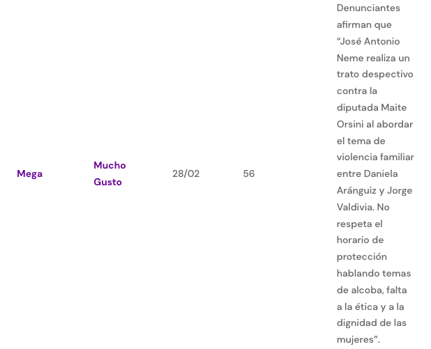 Según sostiene el CNTV, los reclamos se generaron por un eventual “trato despectivo contra la diputada Maite Orsini al abordar el tema de violencia familiar entre Daniela Aránguiz y Jorge Valdivia. No respeta el horario de protección hablando temas de alcoba, falta a la ética y a la dignidad de las mujeres”.