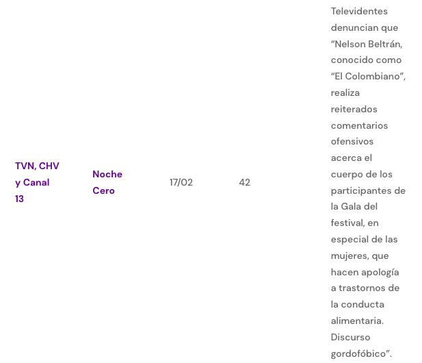 Posteriormente, se aprecian 42 denuncias en contra de Nelson Beltrán, quien “realiza reiterados comentarios ofensivos acerca el cuerpo de los participantes de la Gala del festival, en especial de las mujeres, que hacen apología a trastornos de la conducta alimentaria. Discurso gordofóbico”, aseguraron los televidentes.